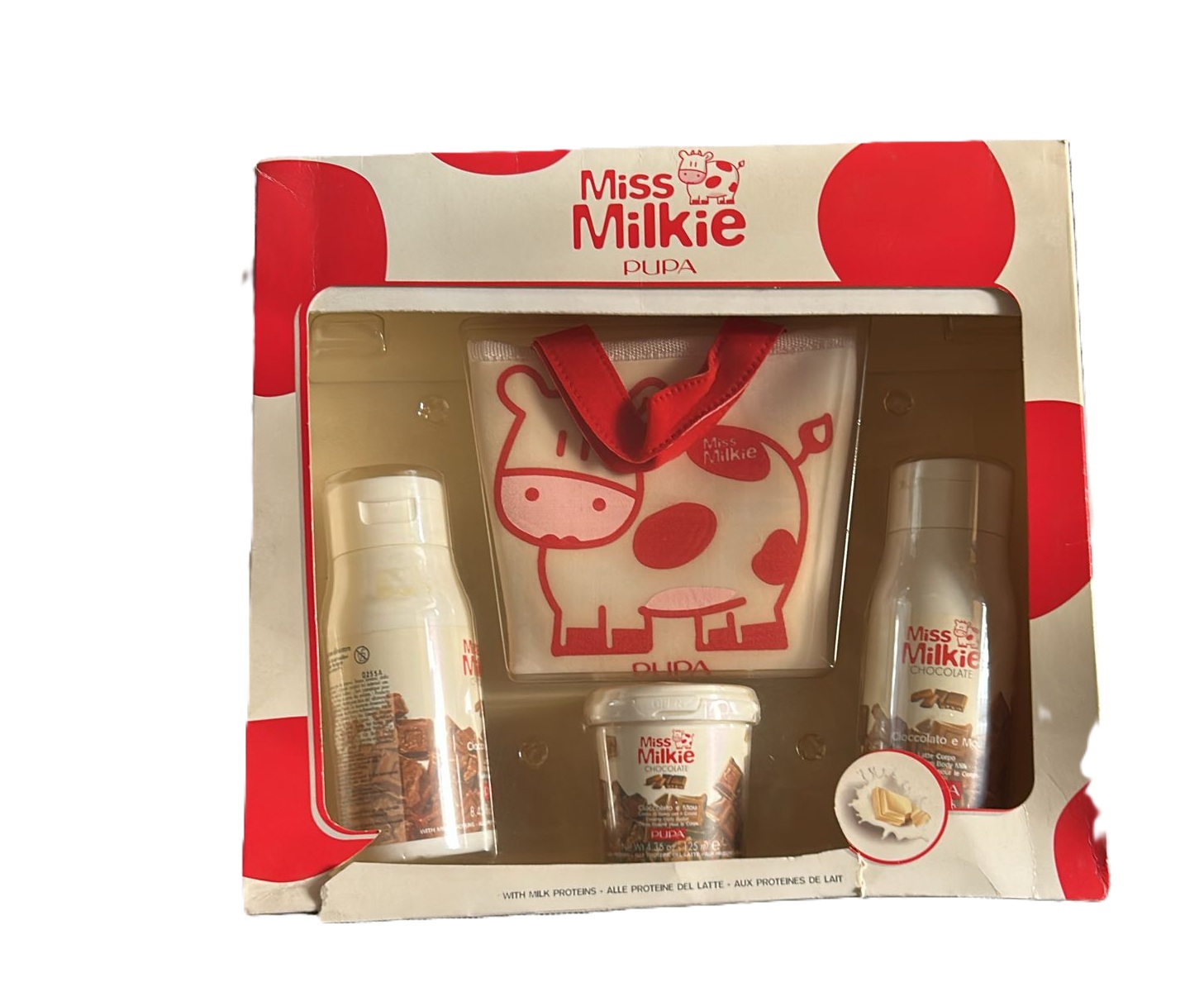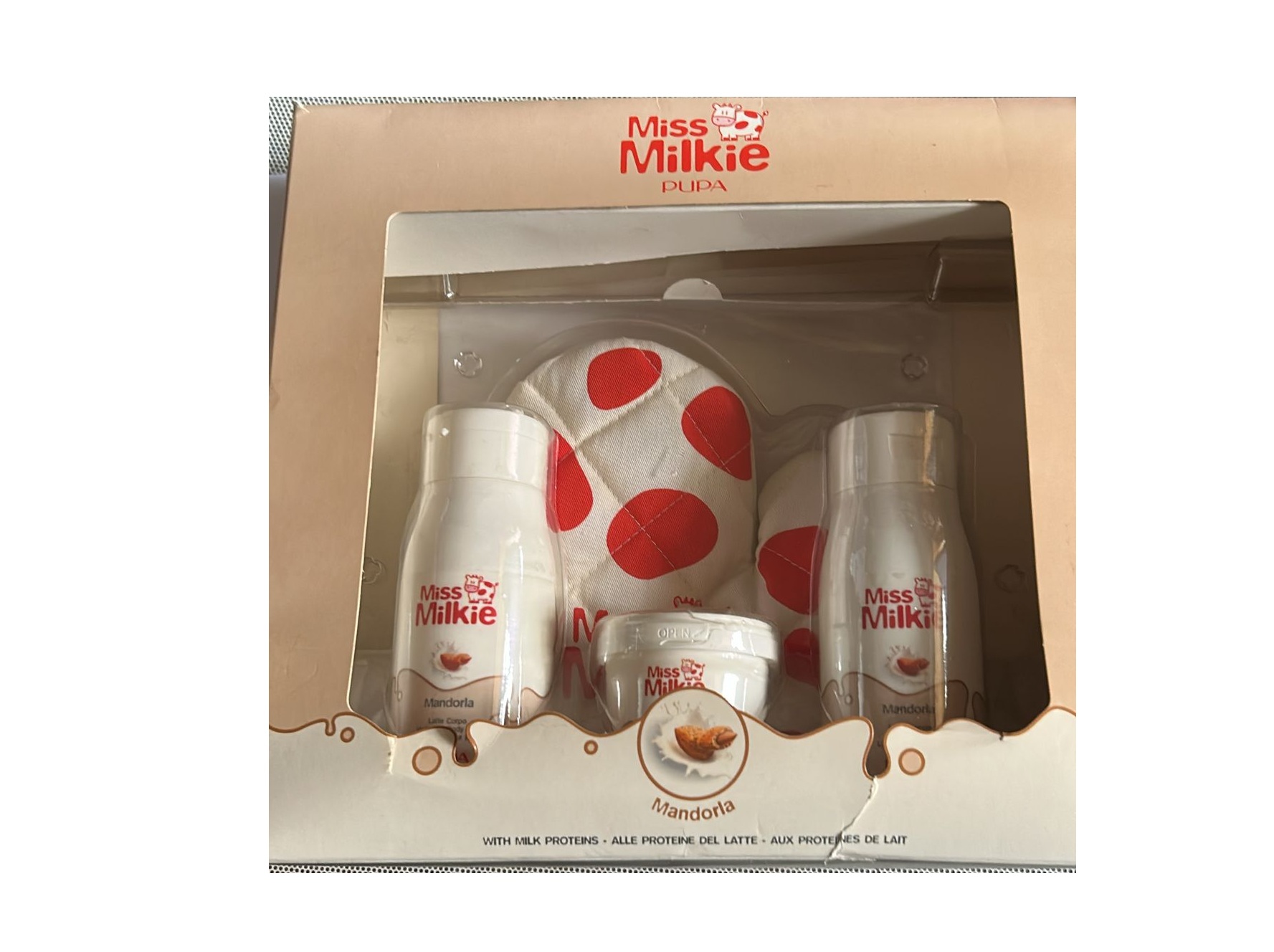 Miss Milkie set : burro corpo 125 ml + Latte doccia 250 ml + Latte corpo profumato 250 ml + borsettima con logo