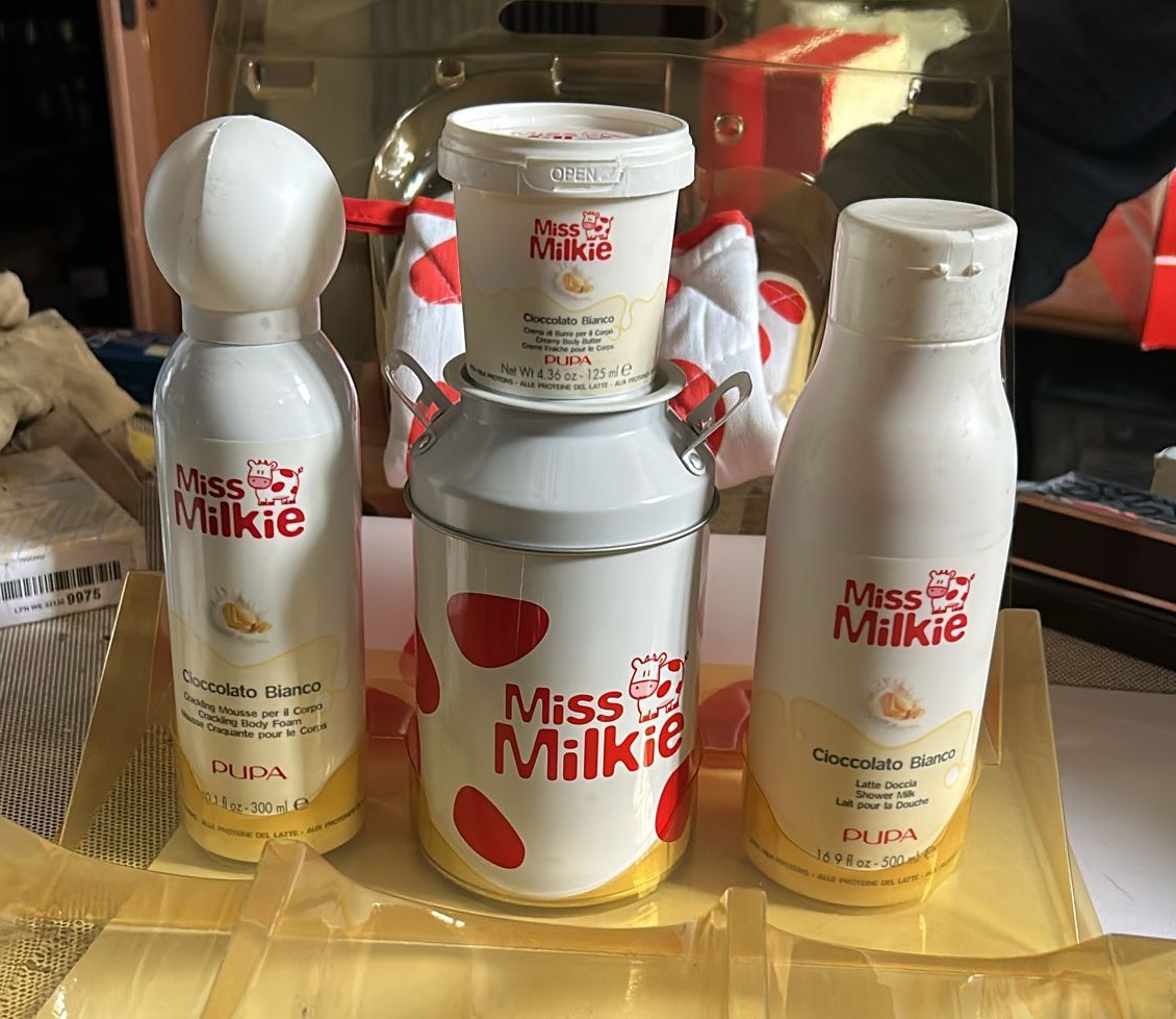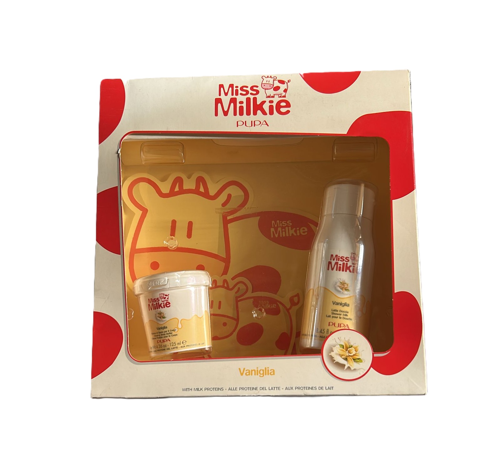 Miss Milkie valigetta media : burro corpo 125 ml + Latte doccia 250 ml + Latte corpo profumato 250 ml + presina